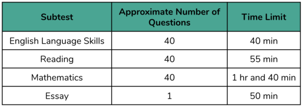 The GK exam consists of four subtests with a combined total of 120 questions. The English Language Skills, Reading, and Mathematics subtests each have approximately 40 questions. Despite having approximately equal numbers of questions, the testing time is different for each subtest. The last subtest consists of one essay question.